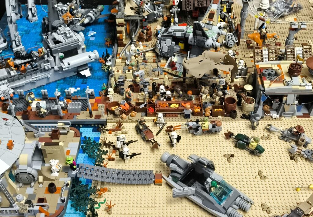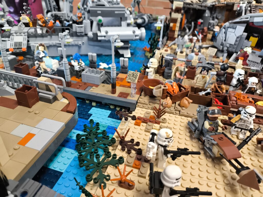 Une patrouille de stormtroopers circule lentement entre les étals, maintenant un semblant d’ordre dans ce tumulte de senteurs, de langues et de négoce.