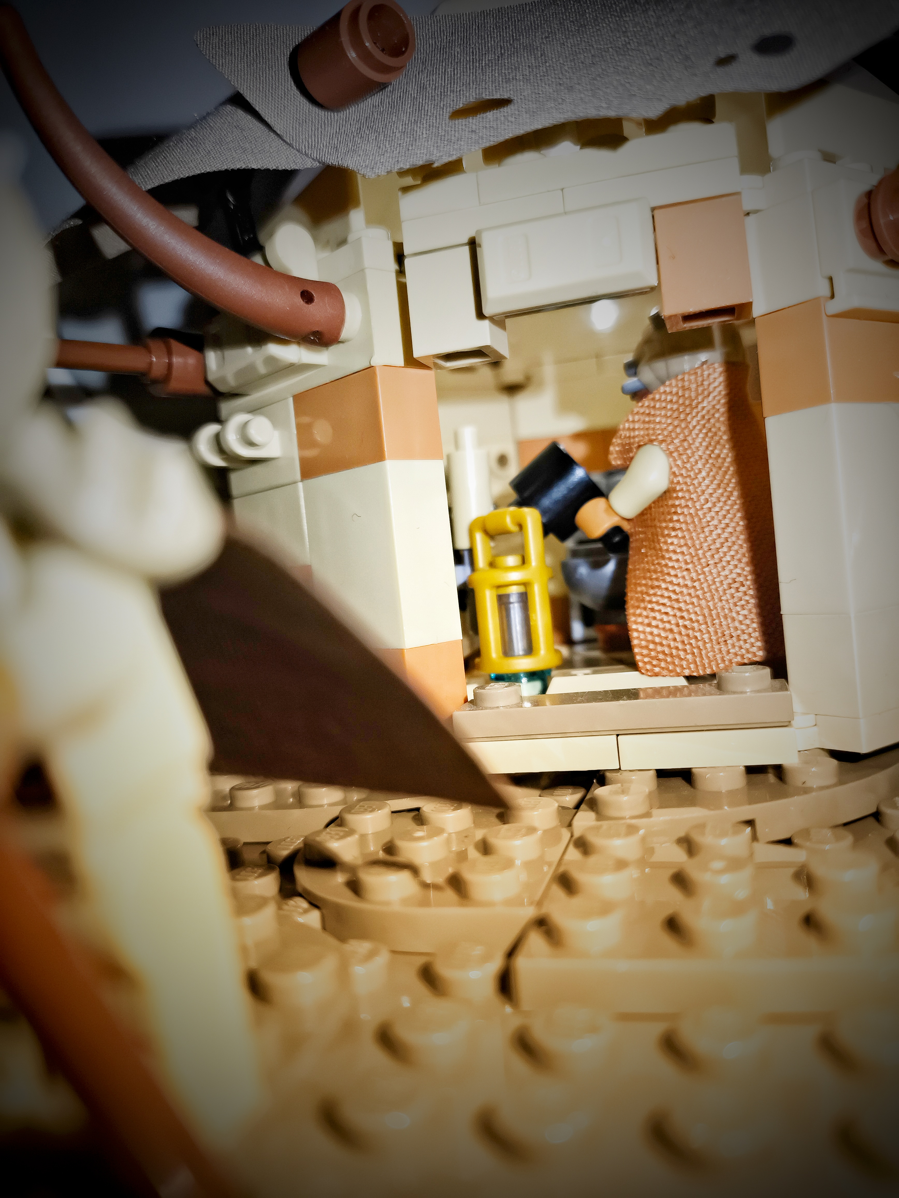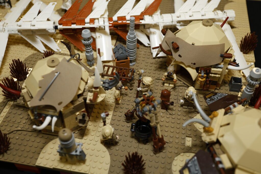 Leurs gaffi-sticks, déjà emblématiques, se sont adaptés : plus courbes, plus légers, décorés de pointes chitineuses provenant des créatures locales. Les Tuskens utilisent aussi de nombreux fragments de leur vaisseau écrasé, intégrés dans leur artisanat.
